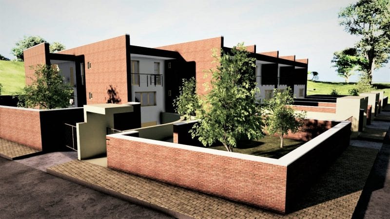 L’ exemple suivant concerne l’insertion d’un projet de maison mitoyenne dans un terrain légèrement incliné ettrapézoïdale. Le terrain est entouré de trois côtés par des rues situées dans une zone semi-périphérique de la ville.